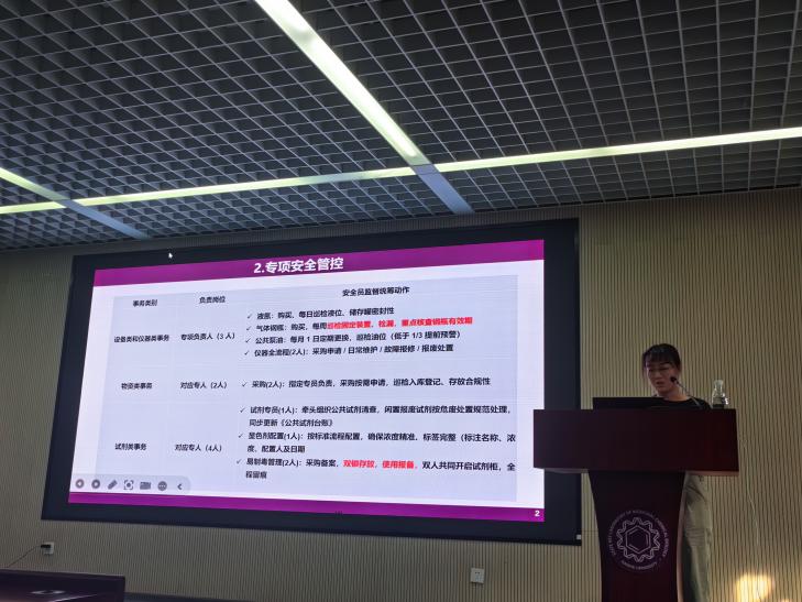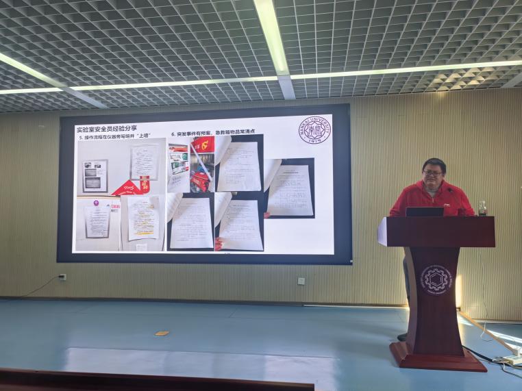 在培训环节,首先由3名学生安全员做典型发言,介绍各自课题组安全管理经验。李思铮以“安全无小事,关键靠落实”为题,从实验室安全事故案例分析总结出关于维护实验室安全的8项建议;宫铭瑜以“规范日常安全检查,强化安全责任意识”为题,分享了课题组常态化的日常安全检查以及凝聚力量、全员参与的经验;李想结合所在课题组安全管理实践经验,介绍了化学合成实验室的日常巡检机制、专项安全管控以及卫生责任体系。