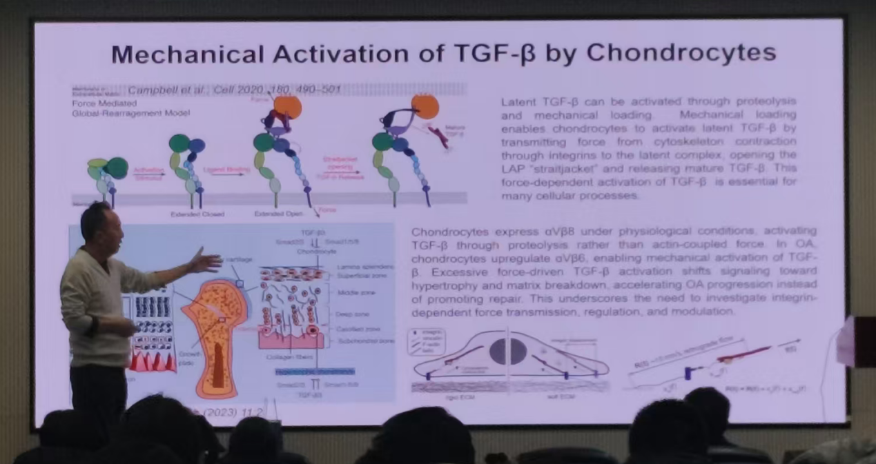 严洁研究员的报告题目是《Molecular and Biophysical Principles of Mechanosensing for AI-Assisted Mechanomedicine》,核心围绕多肽药物的AI设计、细胞机械传感原理与调控,介绍了骨关节炎机械生物学机制,说明机械信号异常对软骨细胞的影响及标志物检测技术,讲解了TGF-β机械激活调控及膜受体机械转导作用,其研究为相关疾病治疗提供新思路。